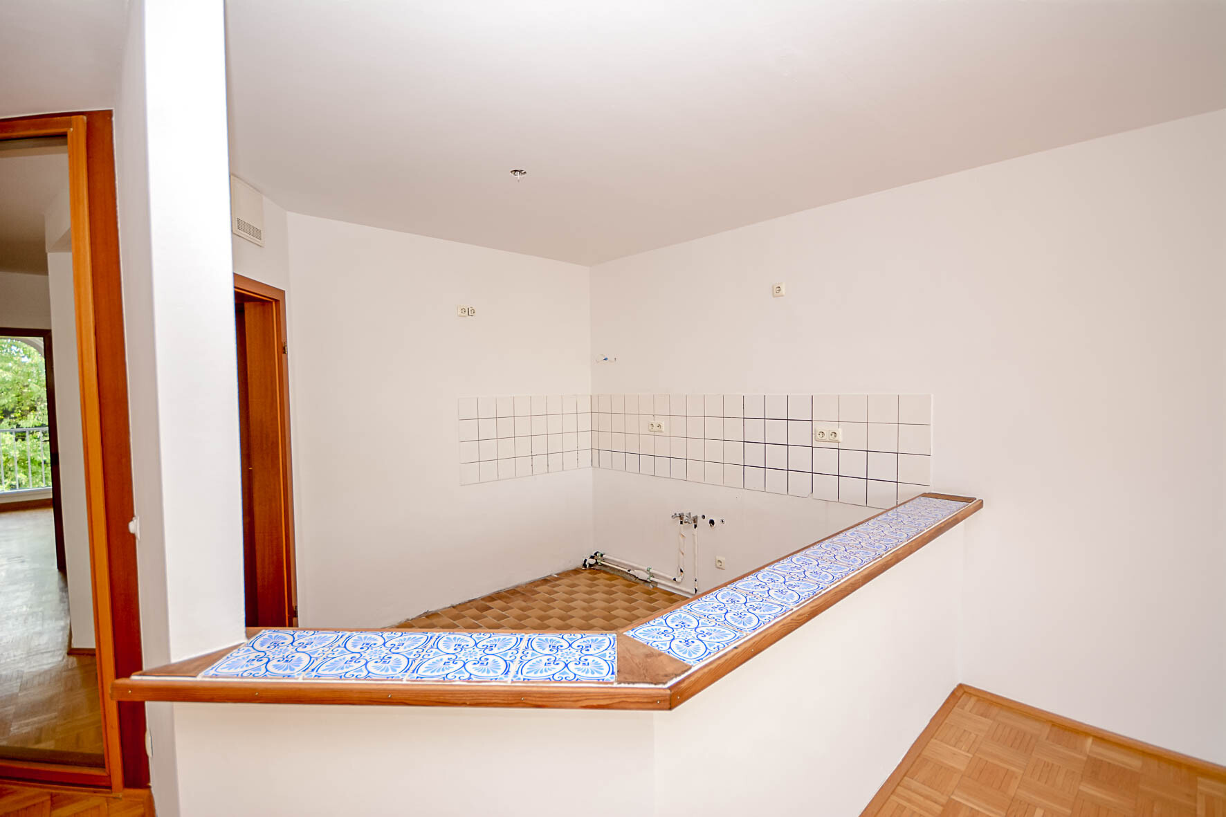 Das Raumkonzept ist offen und einladend gestaltet: Zwischen dem Wohnzimmer und der Küche sorgt eine halbhohe Mauer für eine gelungene Verbindung von Koch- und Wohnbereich, ohne den Blickfluss zu unterbrechen. Vom Wohnzimmer aus gelangen Sie auf den sonnigen Balkon, der zusätzlichen Raum zum Entspannen bietet. Neben dem großzügigen Wohn-/Essbereich stehen ein Schlafzimmer sowie ein Kinder- oder Arbeitszimmer zur Verfügung. Das Badezimmer ist mit Wanne und Dusche ausgestattet, entspricht jedoch noch dem Baujahr und bietet Potenzial für eine Modernisierung nach eigenen Vorstellungen. Ein überdachter PKW-Stellplatz ist im Kaufpreis enthalten.