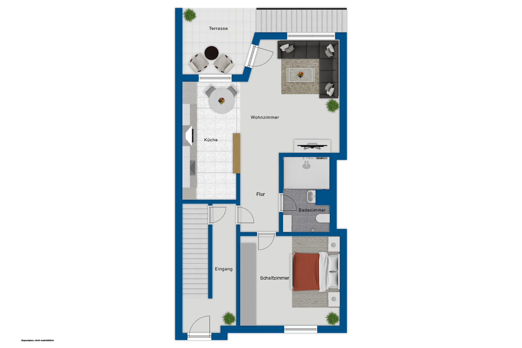 Das Haus verfügt über drei abgeschlossene Wohneinheiten, jeweils eine pro Etage. Die Erd- und Obergeschosswohnung sind schnittgleich und bestehen aus einem offenen Wohn- und Essbereich, einem Schlafzimmer und einem geräumigen Duschbad. Die Erdgeschosswohnung verfügt zusätzlich über den Zugang zum Garten sowie eine Terrasse mit Süd-West-Ausrichtung. Die OG-Wohnung hat einen Balkon bzw. eine Loggia.