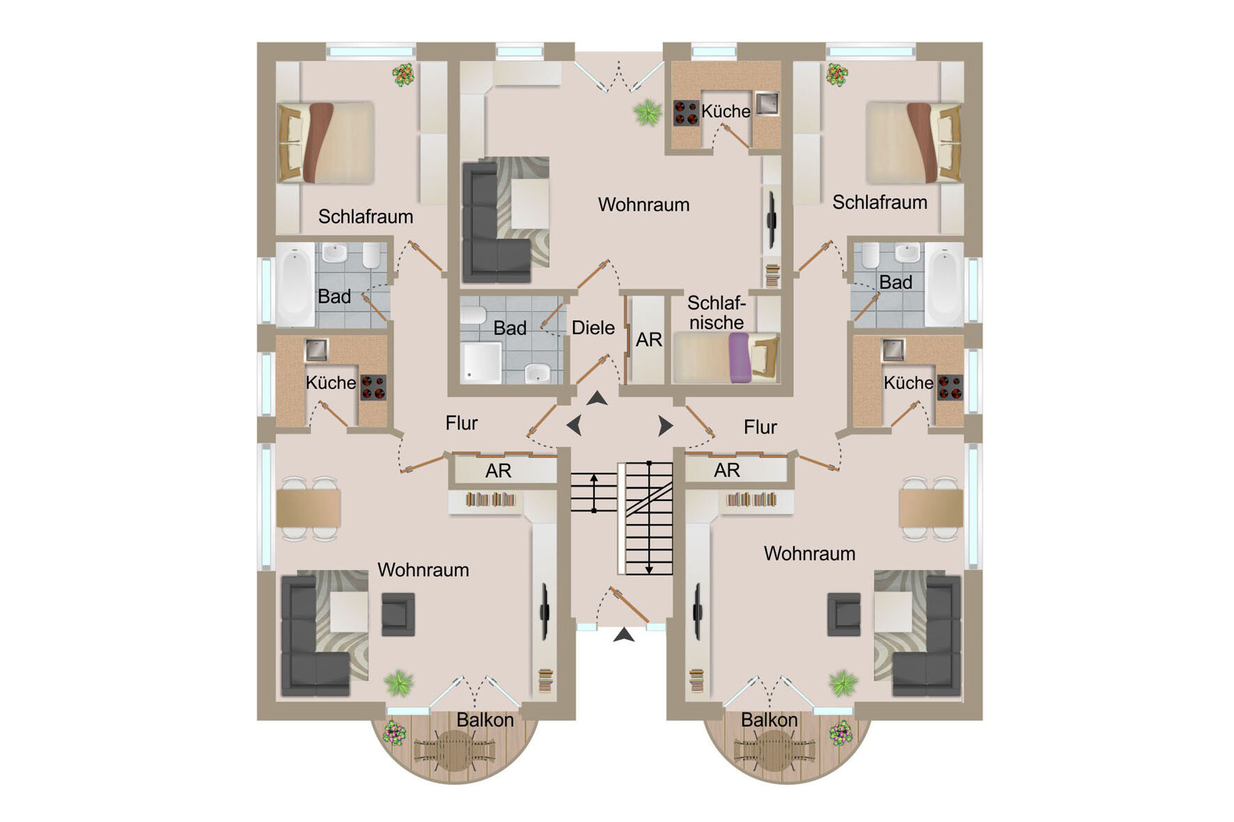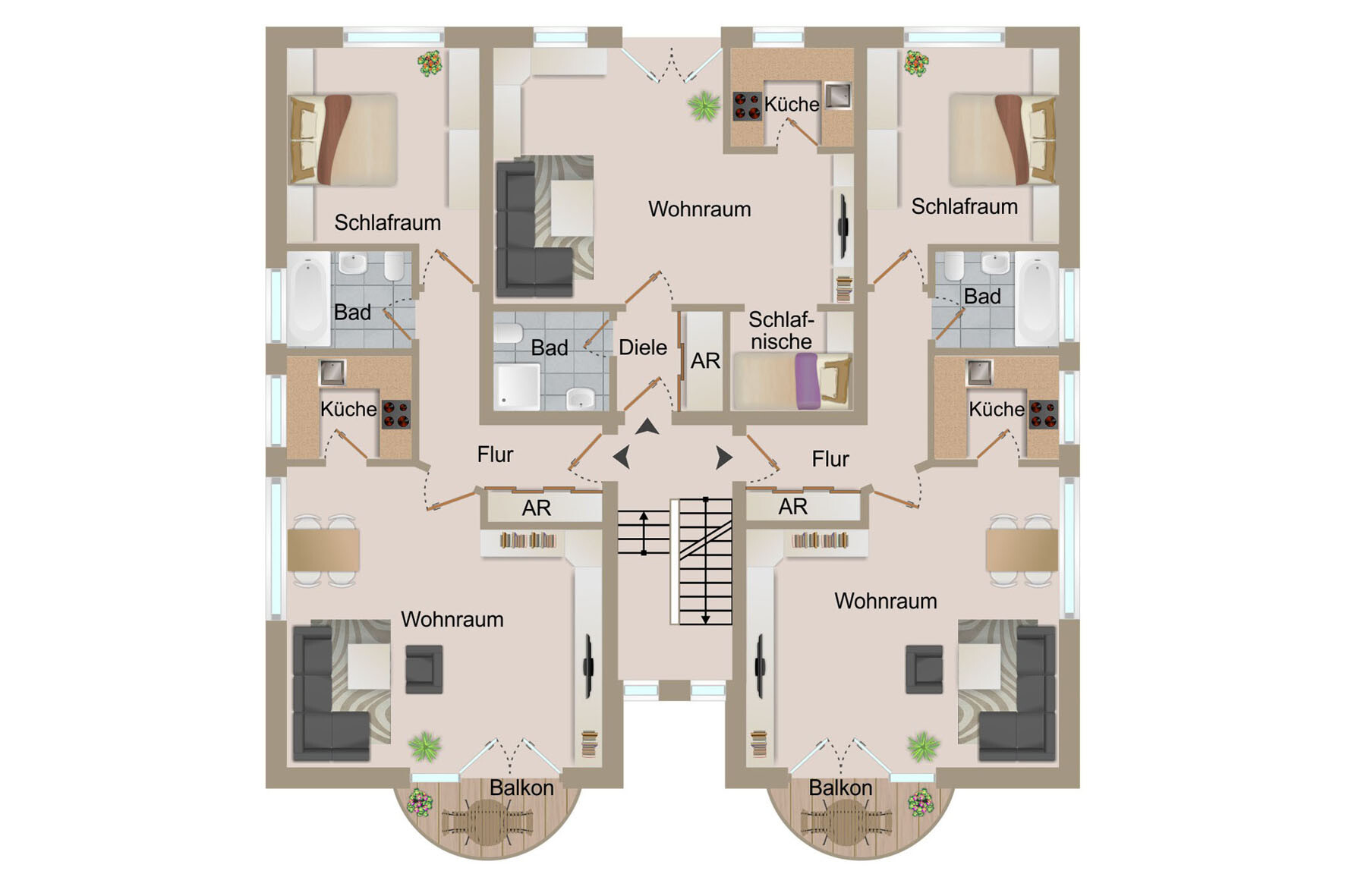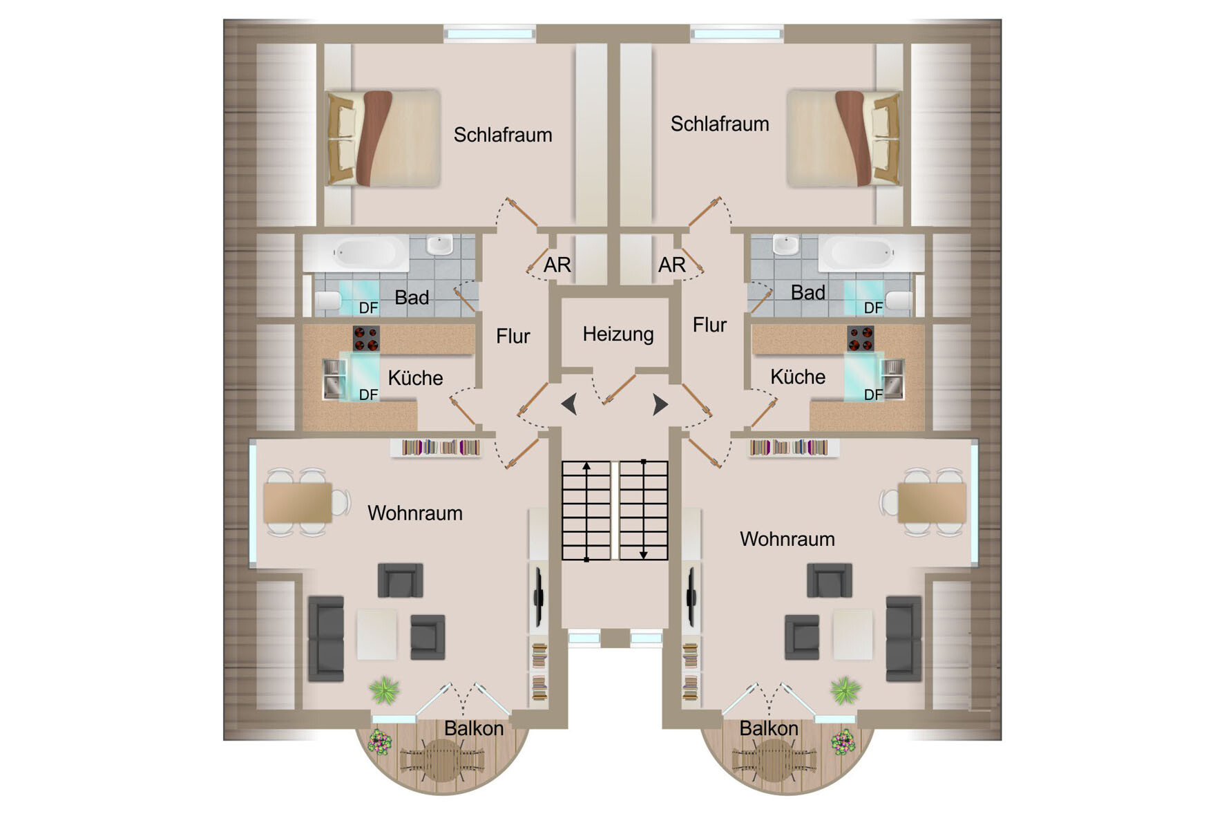Das Haus wurde 1999 erbaut und erstreckt sich über Erdgeschoss, Obergeschoss und Dachgeschoss und ist vollständig unterkellert. Im Erd- und Obergeschoss befinden sich jeweils drei Wohneinheiten, bestehend aus zwei gut geschnittenen 2-Zimmerwohnung sowie einer großzügigen 1-Zimmerwohnung. Im Dachgeschoss sind zwei weitere 2-Zimmerwohnungen untergebracht. Sämtliche 2-Zimmerwohnungen verfügen über einen eigenen Balkon.