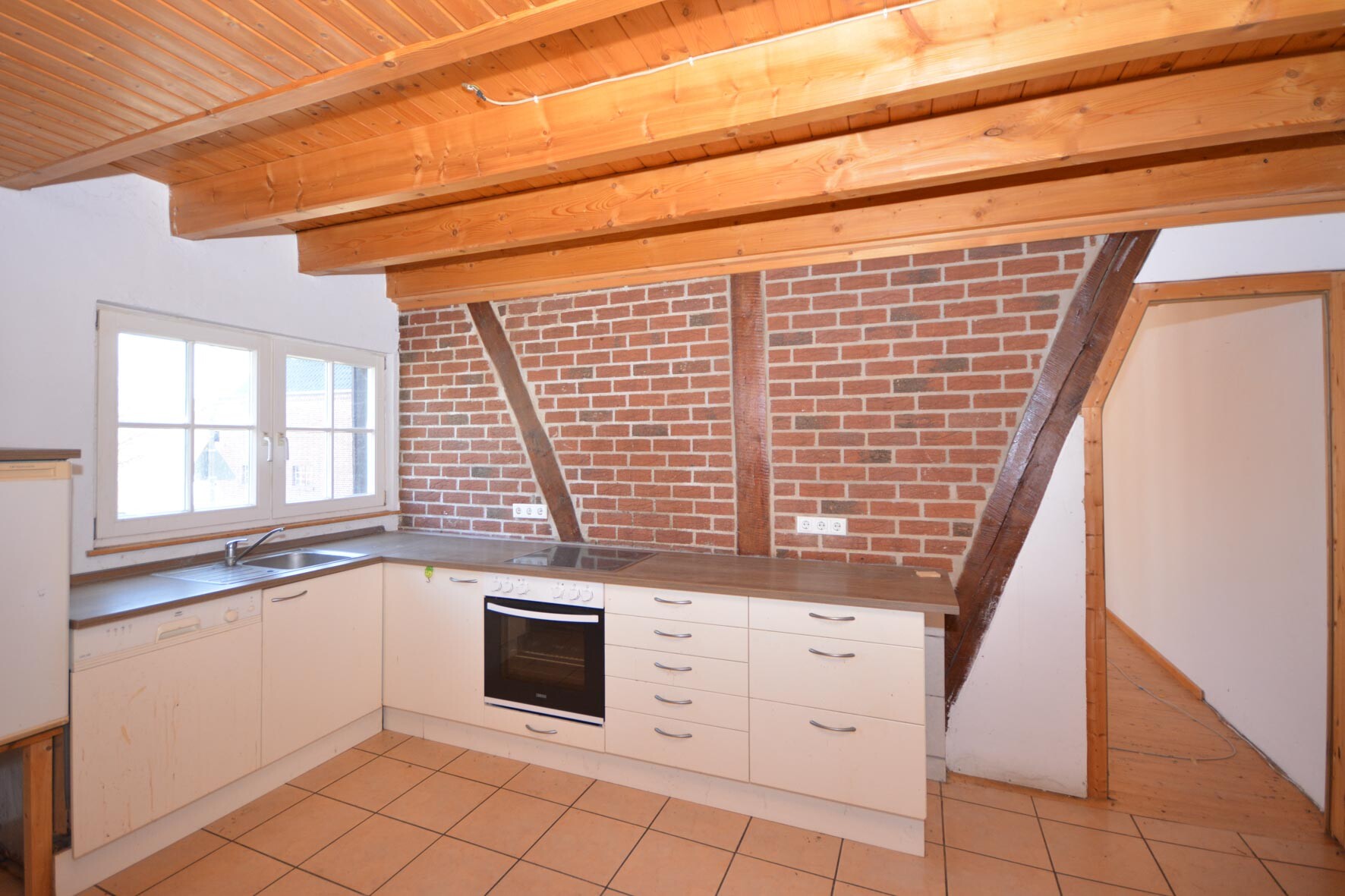 Zum Außenbereich gehören eine großzügige Hoffläche sowie eine offene Scheune. Parkmöglichkeiten sind direkt auf dem Grundstück vorhanden. Einige Modernisierungsmaßnahmen sind erforderlich, insbesondere hinsichtlich Feuchtigkeitsschäden und veralteter Installationen. Dennoch bietet das Objekt eine solide Bausubstanz und vielfältige Nutzungsmöglichkeiten.