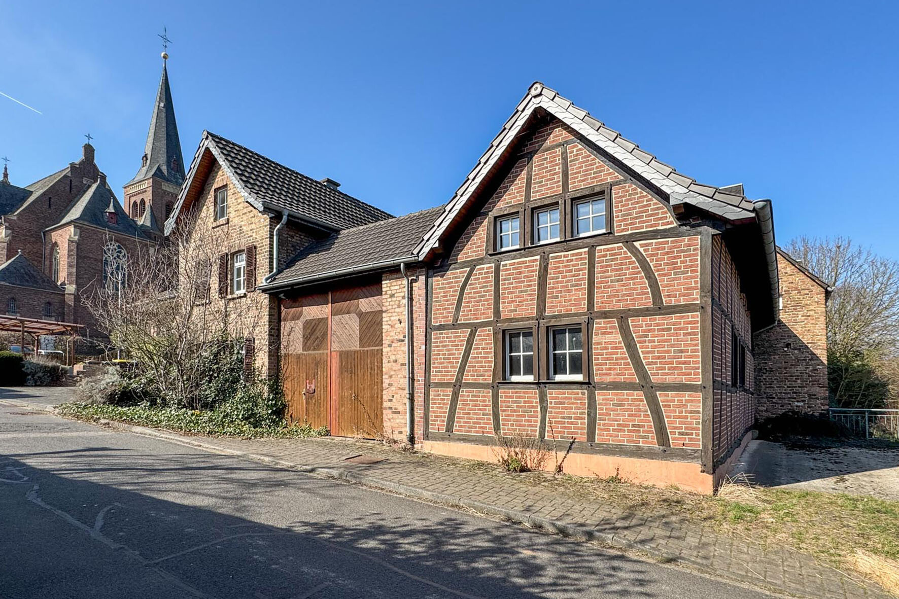 Die Immobilie wurde in massiver Bauweise errichtet, teils mit Fachwerkelementen. Das Satteldach ist mit Tondachpfannen eingedeckt, während die Fenster als Holzsprossenfenster mit Isolierverglasung ausgeführt sind.