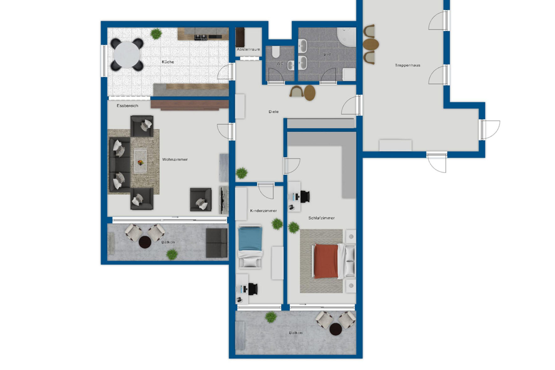 Die Wohnung verfügt über zwei gut proportionierte Schlafzimmer. Von beiden Schlafzimmern aus ist der zweite Balkon zugänglich, der sich ideal als ruhiger Rückzugsort eignet. Ergänzt wird das Raumangebot durch ein Badezimmer sowie ein separates WC sowie einen kleinen Abstellraum.