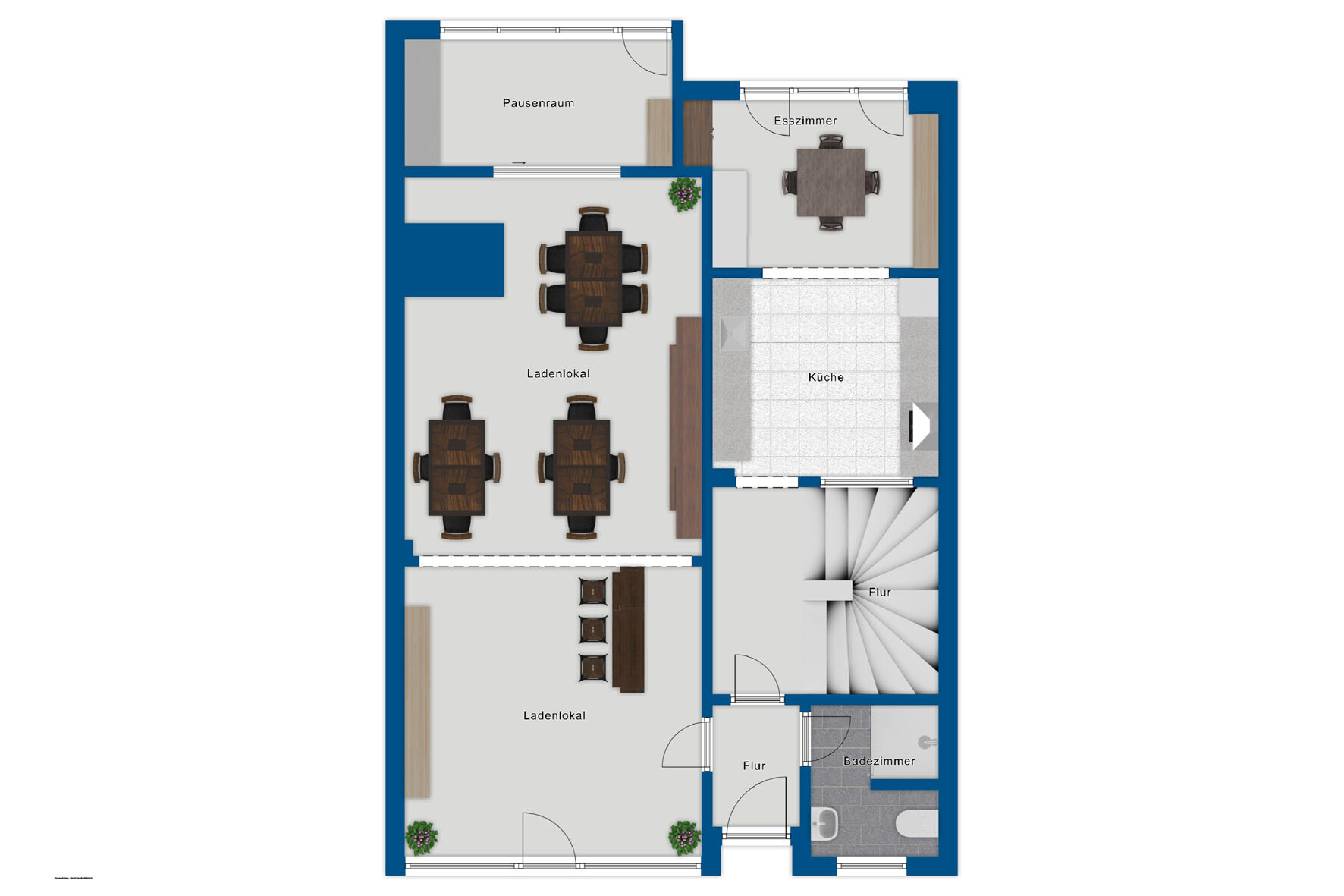 Der größte Teil des Erdgeschosses wurde bisher als Friseursalon genutzt. Da sich in dieser Etage auch die Küche sowie der Zugang zum Garten befindet, bietet sich hier nun die Nutzung als Wohn-/Esszimmer an. Ein Duschbad ist ebenfalls im Erdgeschoss vorhanden.